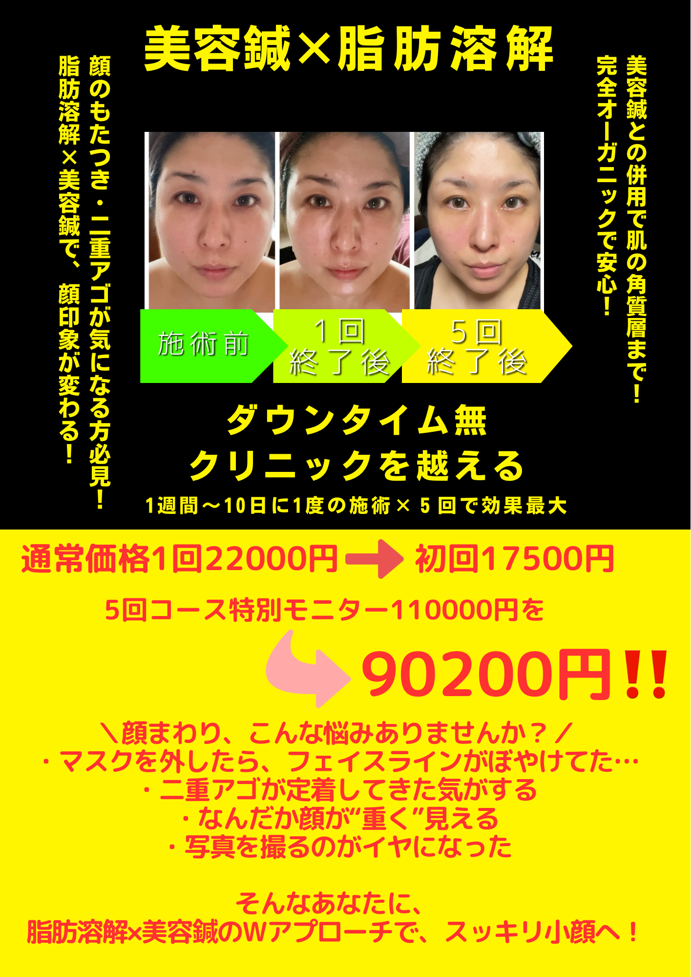 美容鍼とニードル美容の組み合わせで美容以上医療未満の即効肌改善も叶えます。美容鍼でリフトアップ。特殊な機器を使用したニードリングと幹細胞美容液でお悩みお肌もたちまち変化を実感。鍼を理解し扱いに慣れてる鍼灸師の施術でほぼダウンタイム0の安心安全施術(施術後8時間は水濡れ制限有) ヘッドマッサージ、筋膜調整マッサージ、アフターパック、施術後5日間使用していただくアフターセラム(6600円相当)付 美容鍼のEMSは無し |